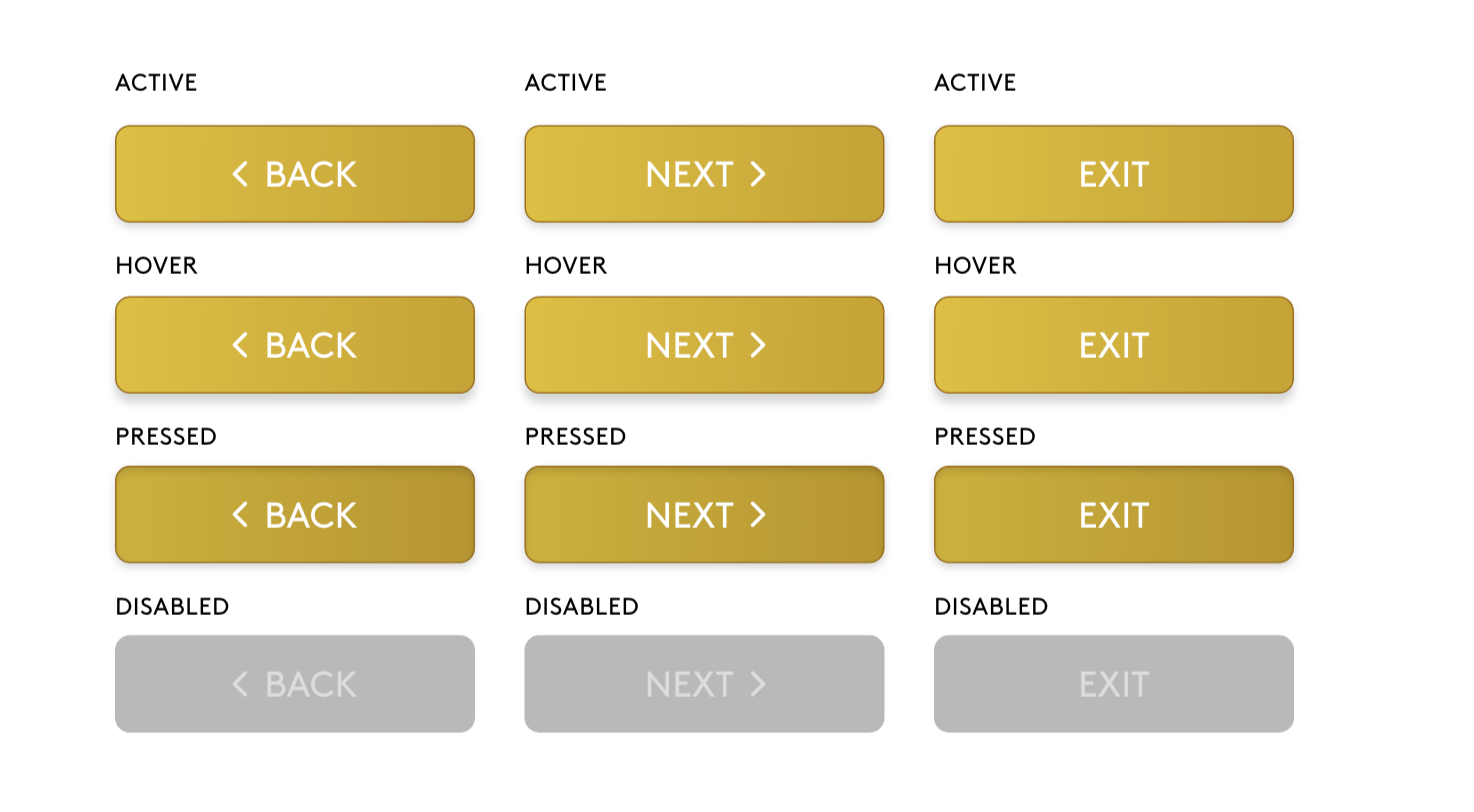 Each button was built with four states: active, hover, pressed, and disabled. The active state is the default, full-color gold. Hover introduces a subtle shadow to signal interactivity. Pressed flattens that shadow to give tactile feedback on touch. Disabled strips the color entirely to a muted gray, clearly communicating to the user that an action isn't available without requiring any additional explanation.