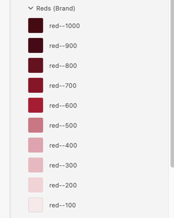 The foundation started with color. I established a naming scale from 100 to 1000+, intentionally leaving room for the system to grow. If a lighter red was ever needed down the line, we could slot in a red-50 without breaking the existing architecture.